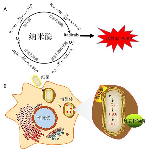 图1. 纳米酶调节ROS及细胞内杀菌原理。(A)纳米酶具有多种类酶活性可以调节活性氧用于杀菌。(B)细胞吞噬细菌到溶酶体通过酶催化产生ROS杀死细菌。