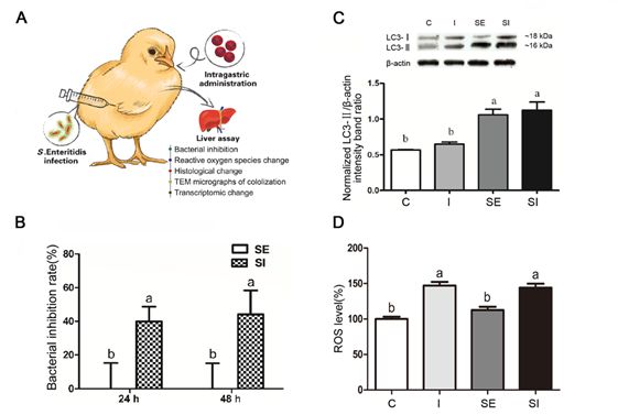 图3. 氧化铁纳米酶胃服小鸡抑制肝内沙门氏菌活性。(A)氧化铁纳米酶胃服小鸡动物实验示意图。(B)氧化铁纳米酶有效抑制肝内沙门氏菌活性。(C)沙门氏菌感染诱导肝内细胞自噬。(D)氧化铁纳米酶提高肝内细胞ROS水平。