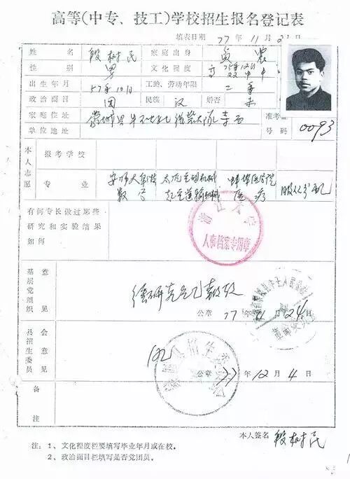 段树民当年的高考报名表